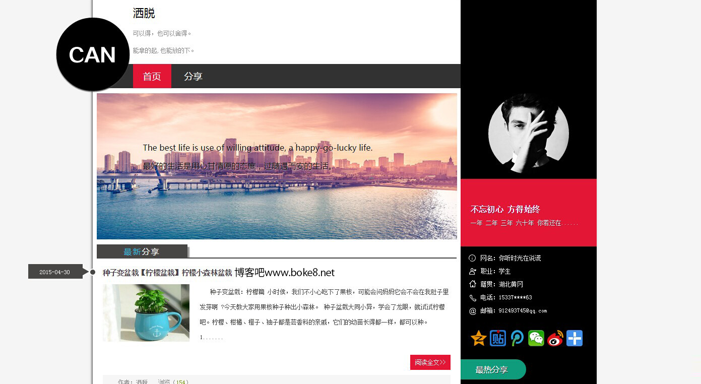 这是一套蓝白色搭配、两栏布局的精品dedecms博客模板,模板包含了首页模板、文章列表页模板、文章内容页模板、图片列表页模板、图片内容页模板以及关于我们页面模板,界面设计精美,兼容IE7+、Chrome、Firefox、Opera、Safari等主流浏览器。作为CMS网站程序性质的织梦DEDECMS,用来搭建博客型站点的用户非常少,因此dedecms博客模板相应的也就不多,想找一款精品dedecms博客模板相当不容易,不妨试试这款!