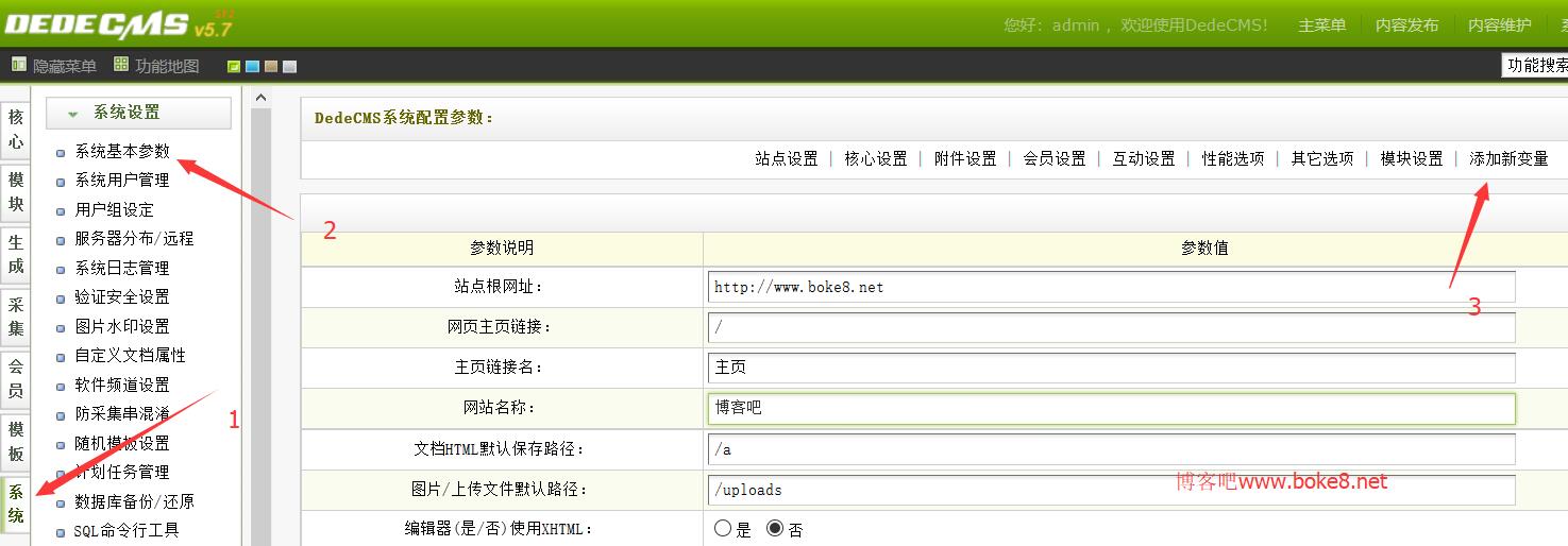 dedecms默认系统基本参数设置只提供了常规的设置选项,难以满足站长的需求,也许dedecms因为考虑到这一点,所以在系统基本参数中还提供了“添加新变量”的功能,通过添加新变量dedecms用户就可以在默认设置选项的基础上增加其它自定义设置选项,如电话号码、邮箱地址、联系地址、QQ号、微博等一些设置选项,然后在前台进行调用。下面博客吧分享如何对dedecm...